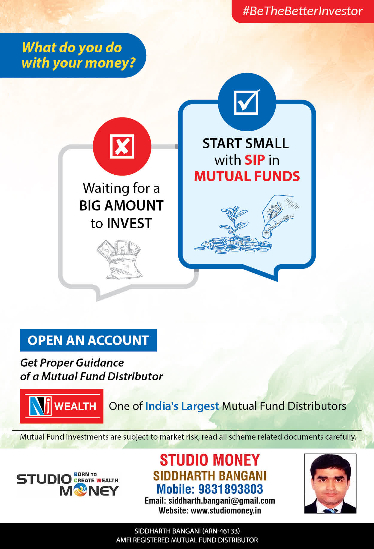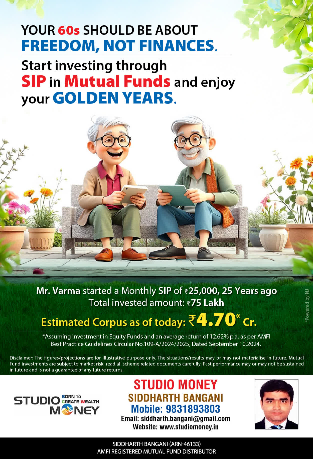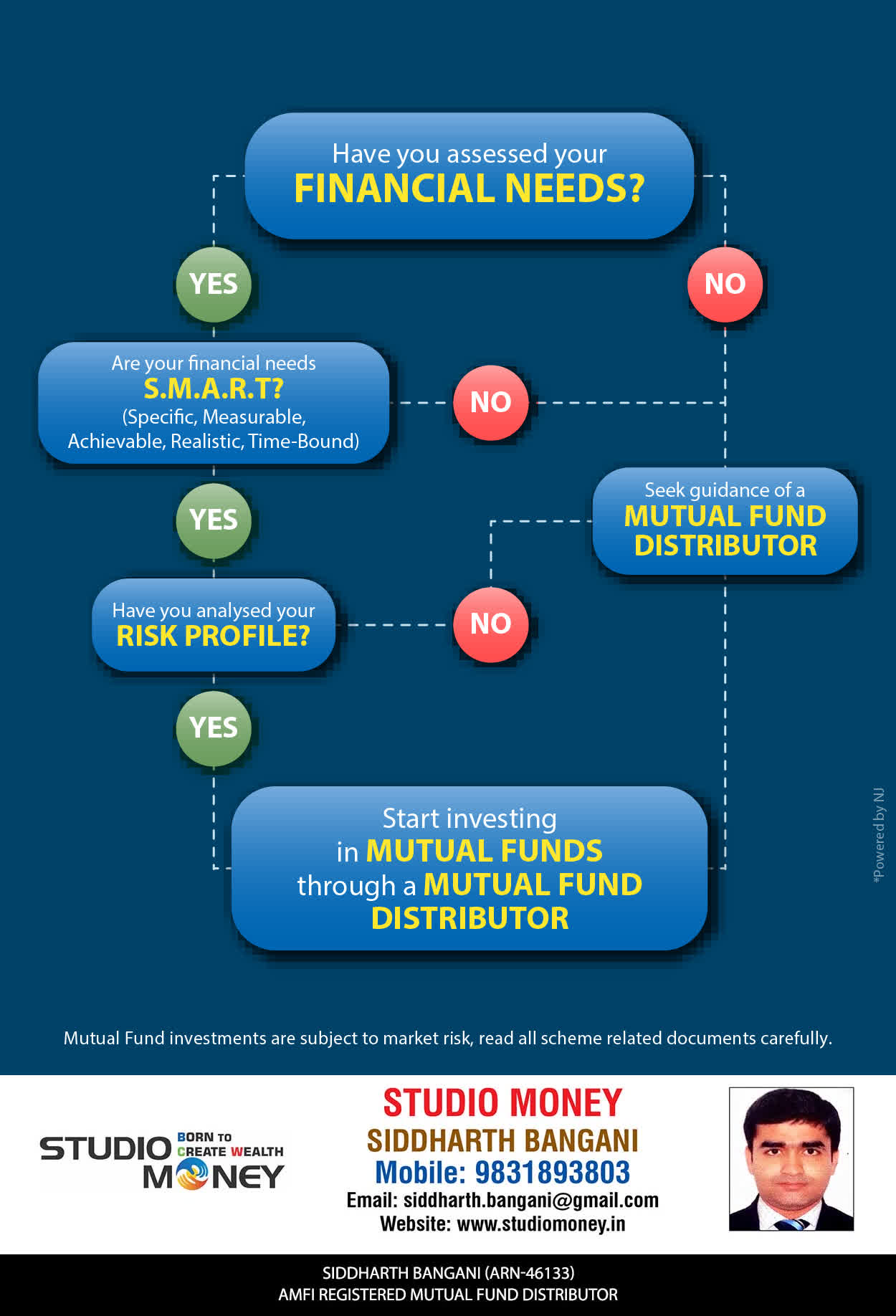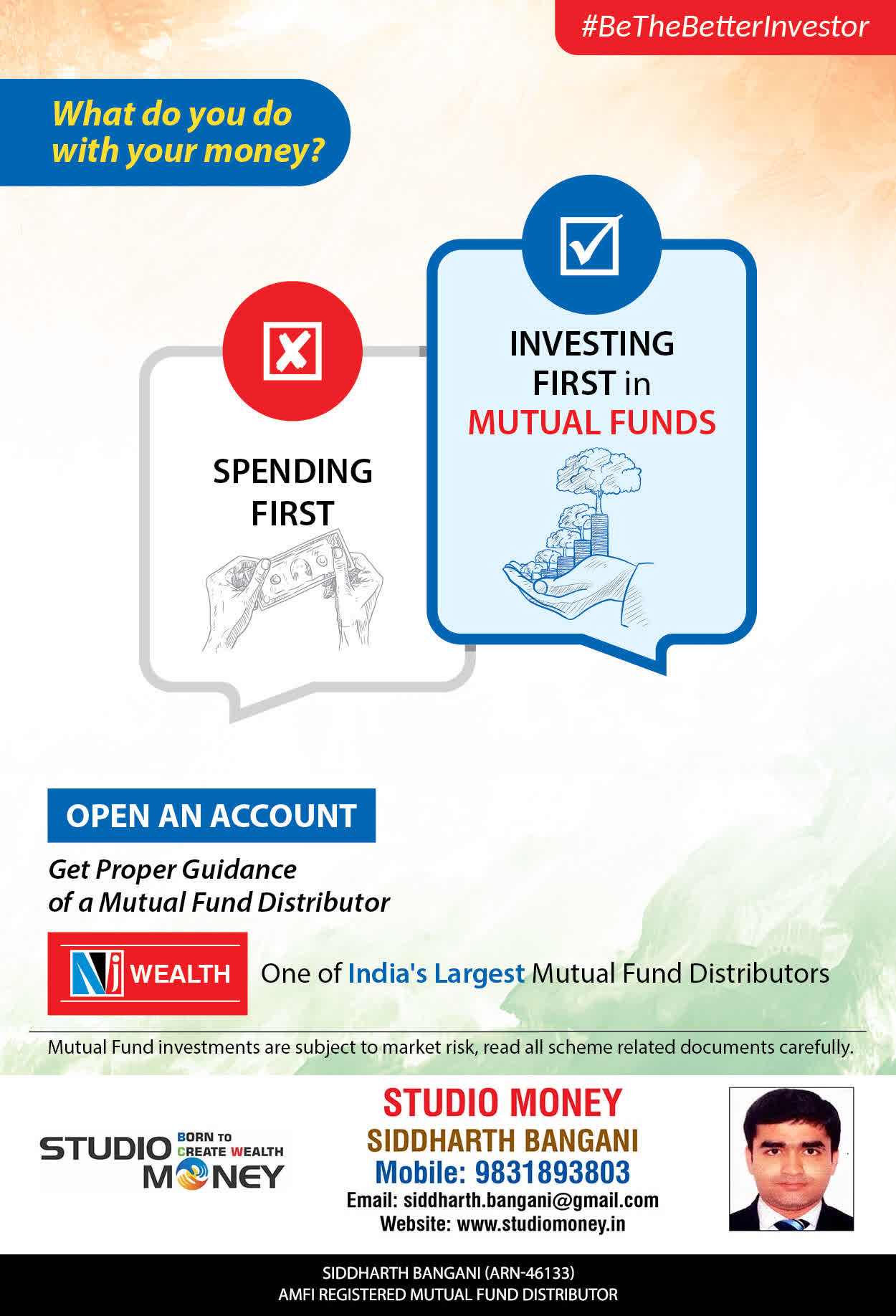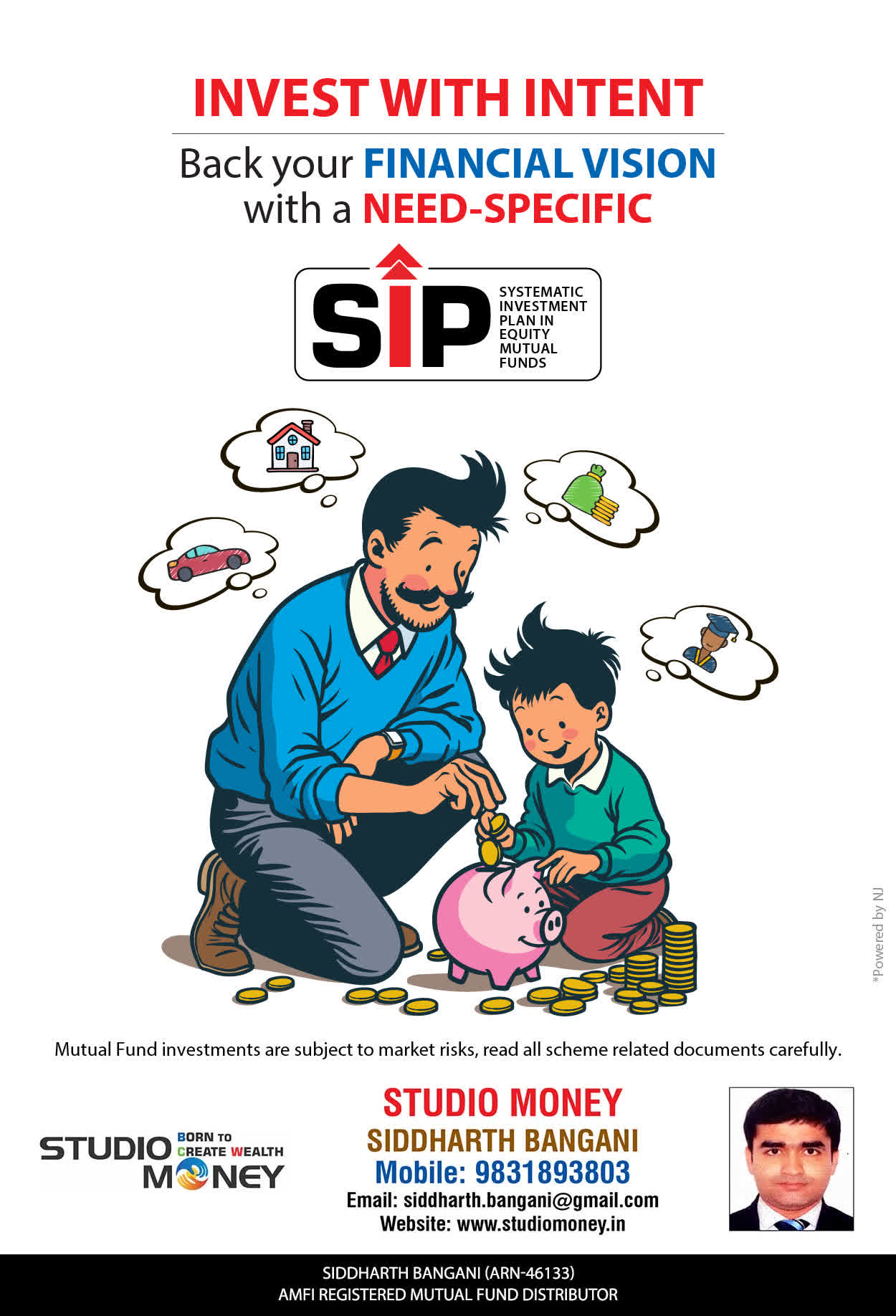 At STUDIO MONEY, our mission is to provide our clients with the comprehensive, competent, customised and classy best solutions in wealth creation and wealth management areas. We are driven to provide clients with simple, unbiased and uncluttered professional advice that adds value to their quality of life and results in actionable solutions.