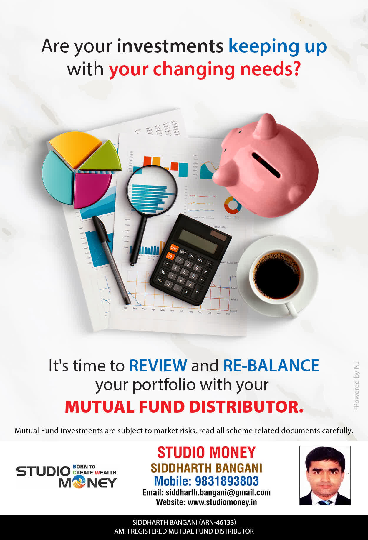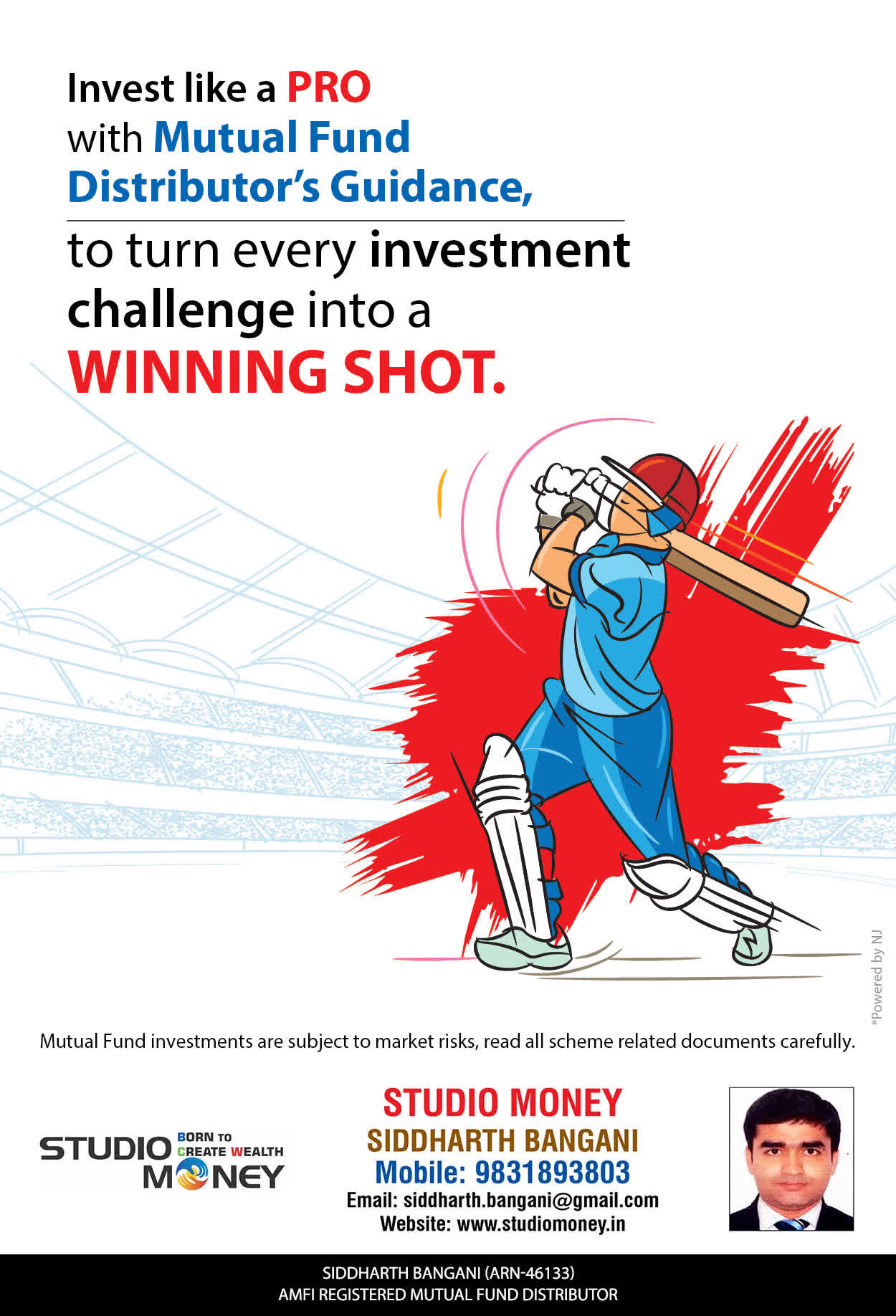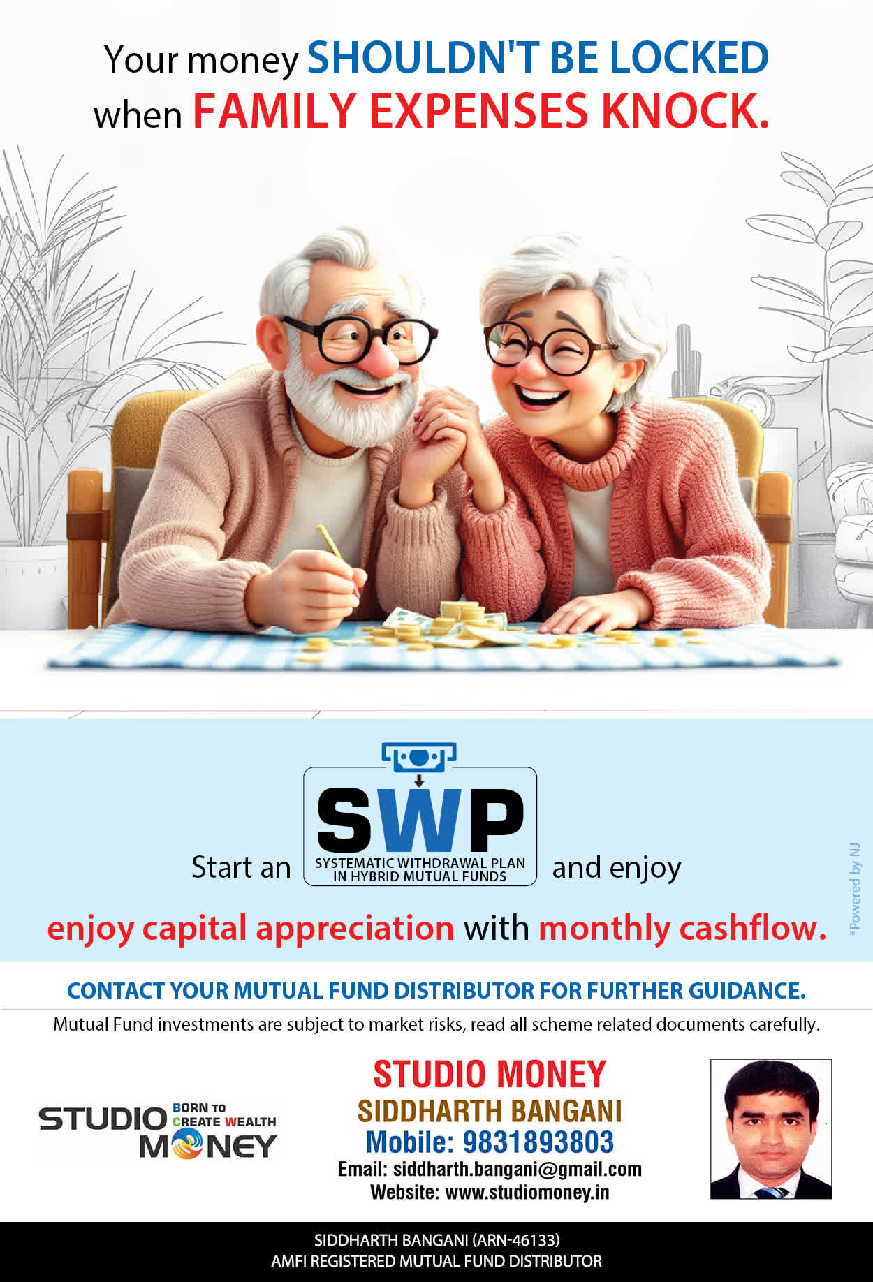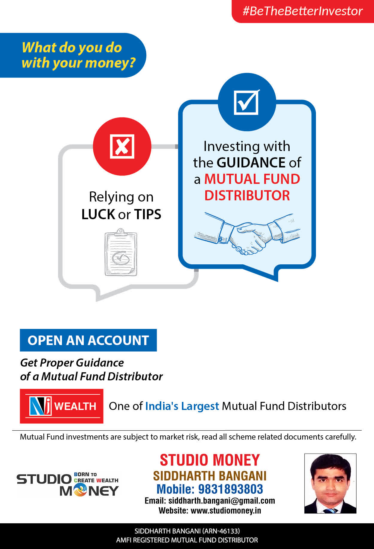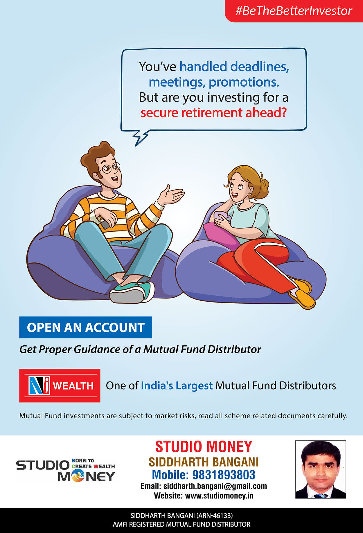 At STUDIO MONEY, our mission is to provide our clients with the comprehensive, competent, customised and classy best solutions in wealth creation and wealth management areas. We are driven to provide clients with simple, unbiased and uncluttered professional advice that adds value to their quality of life and results in actionable solutions.