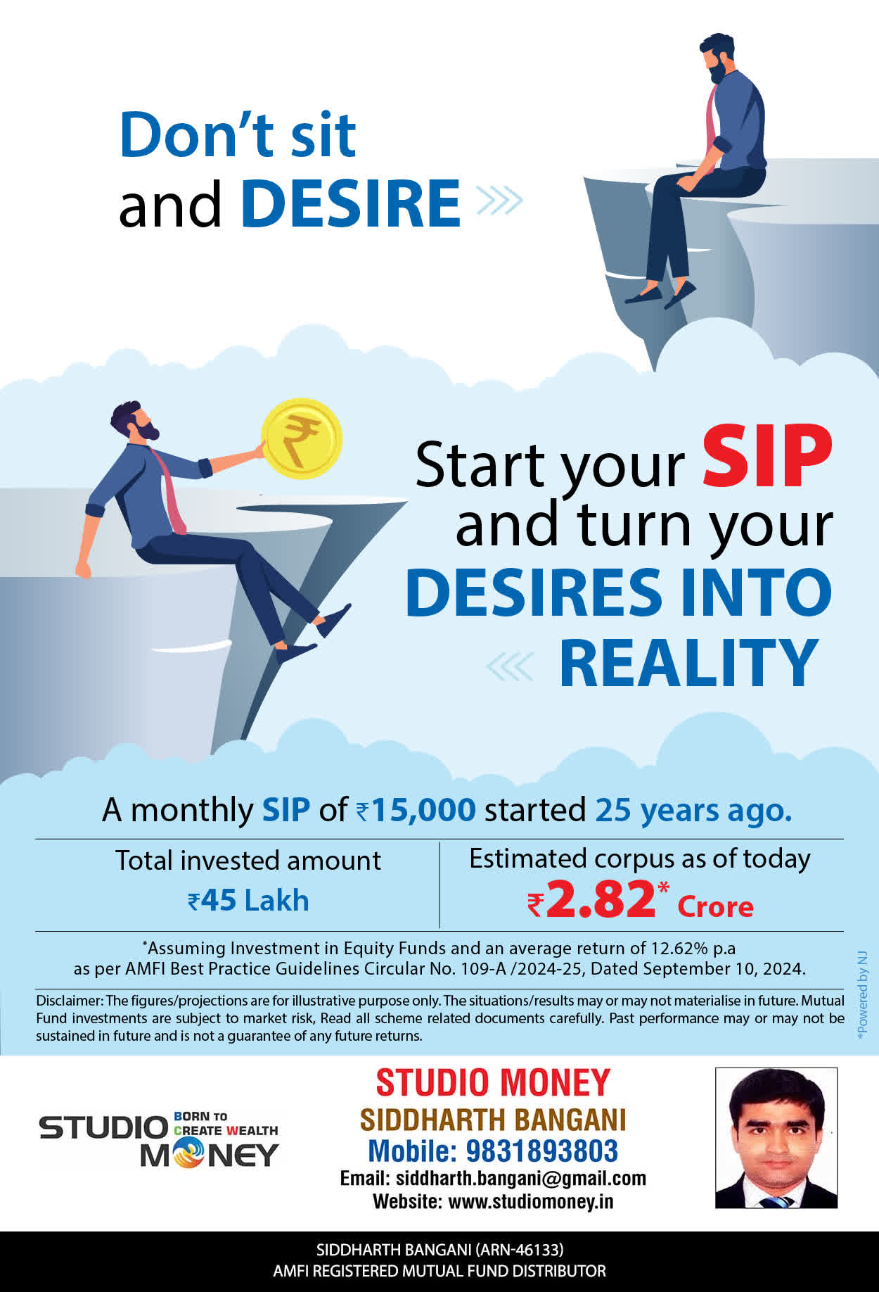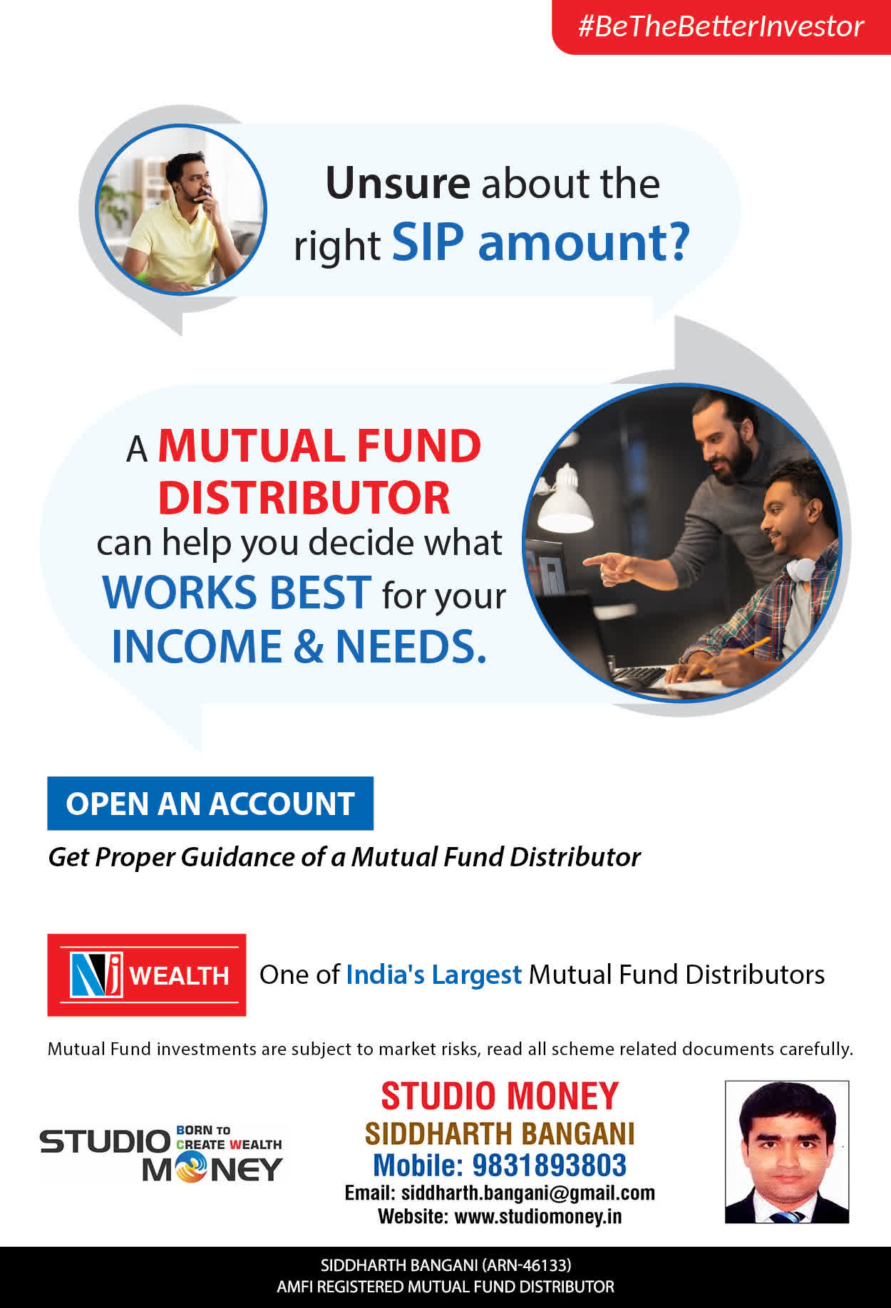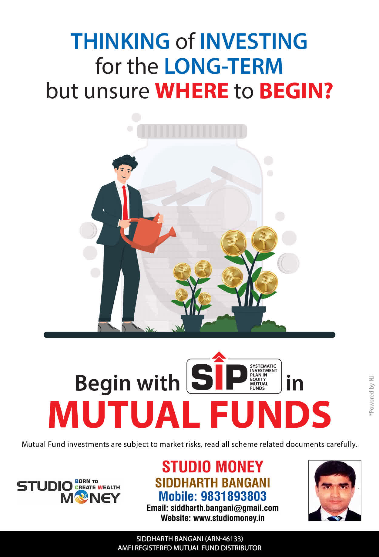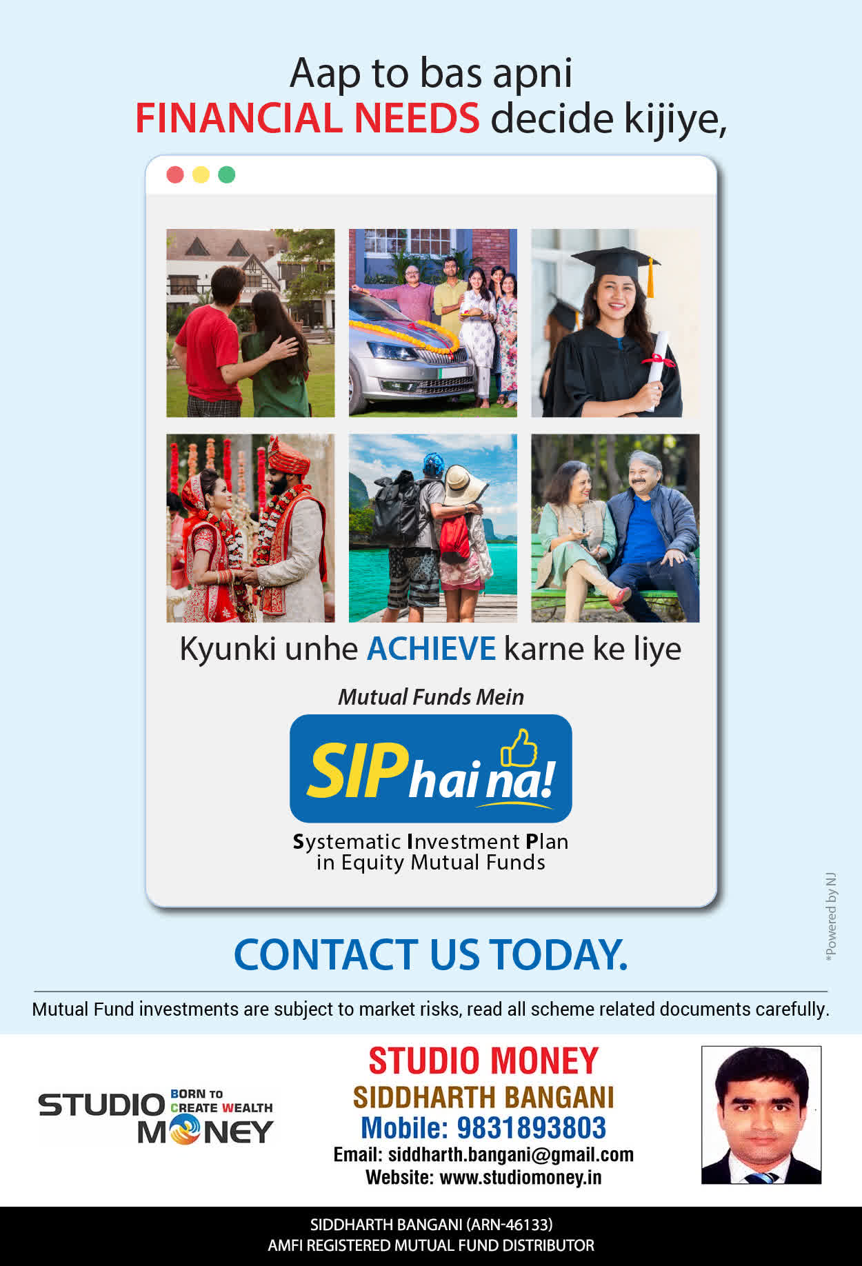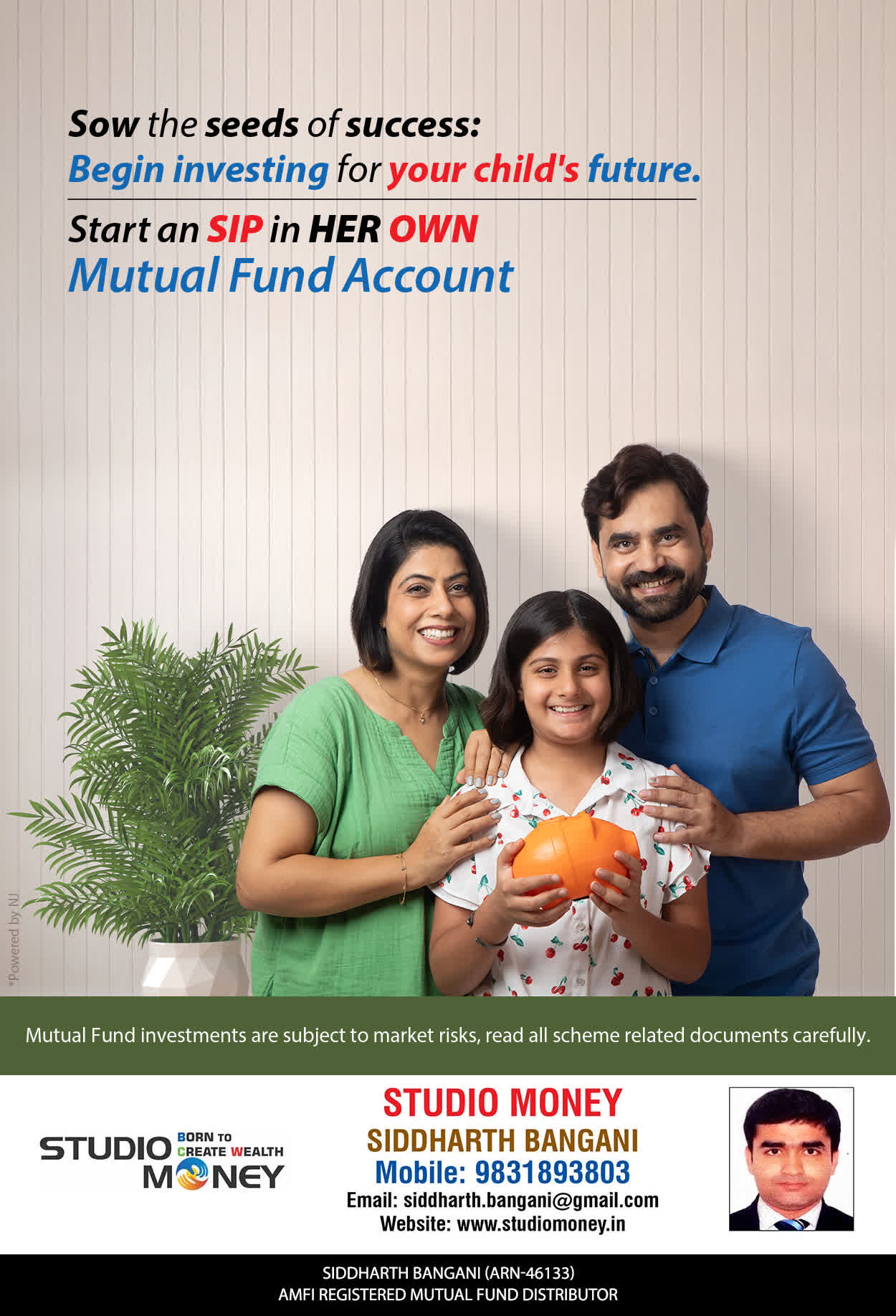 At STUDIO MONEY, our mission is to provide our clients with the comprehensive, competent, customised and classy best solutions in wealth creation and wealth management areas. We are driven to provide clients with simple, unbiased and uncluttered professional advice that adds value to their quality of life and results in actionable solutions.